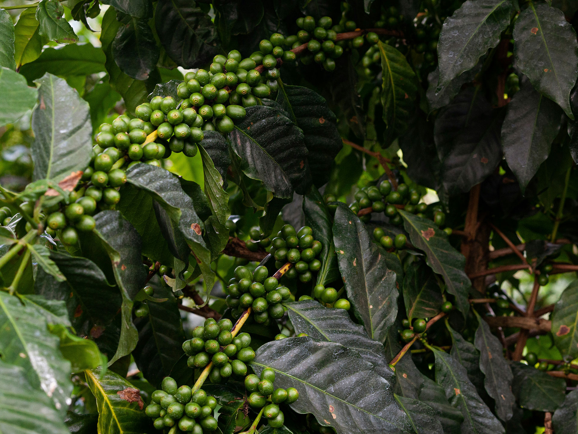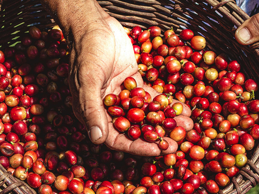 Ripe coffee cherries are handpicked when they turn bright red. This careful selection ensures quality.